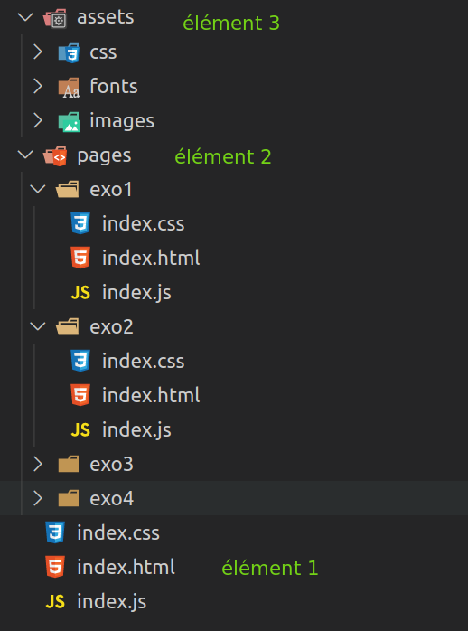 Et le dossier /assets contient tous les fichiers globals, c'est à dire les fichiers de CSS communs à toutes les pages, les images qu'elles ont besoin, et les polices d'écriture utilisées. (élément 3)